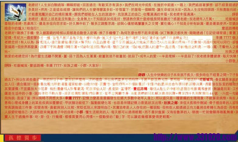 | 第055期 《六合皇信箱文字版》10000%正確!!!正版331020論壇*精心製作!!! 錚錚、吃飯喊我、豐迴路轉、幸運7777、壯族之鄉、小群,大家好! 【1】.老總好!人生如白駒過隙,轉瞬即逝。回首過往,有歡笑亦有淚水。我們在時光中成長,在挫折中前進。一路上,我們追逐著夢想,卻不經意錯過許多美好。然而,正是這些經歷,讓我們的人生變得豐富多彩。珍惜當下,把握每一個瞬間,讓生命綻放光彩。因為人生沒有回頭路,只有勇敢向前,才能書寫屬於自己的精彩篇章。願我們都能在人生的旅途中,找到真正的自己,收穫滿滿的幸福。祝老總幸福滿滿。 錚錚 →〖錚錚〗:人生中快樂的日子本來就不長久,很多時在不經意之間一下子就過去了。所以在那些曇花一現的好日子中,要好好把握每一次的機會,所以我們要更珍惜時間,千萬不能浪费光陰,要把每一天都活好! 【2】.老總好,最近上班老是沒有動力,全身無力。不知道該如何是好,想請教你買什麼綠植房間客廳好?感謝老總。祝老總年入千萬。 吃飯喊我 →〖吃飯喊我〗:春玄關是家庭的出入口,適合擺放一些寓意比較吉祥的高莖寬葉植物,如發財樹、富贵竹、金錢樹等。不僅寓意好。對室内的溫濕度也有很好的調節效果。而擺放在臥室的植物尤其要謹慎,不宜擺放太多花草,有些還會和人爭奪氧氣,可選擇仙人球、虎皮蘭、蘆薈等。 【3】.尊敬的老總,思慮再三, 還是來信向您求助。好久無中彩了,雖多次調整思路,卻與心儀號碼屢屢失之交臂, 實在痛心!不知是分析有缺漏, 還是運氣使然。您猶如暗夜中的爐火!盼指引! 豐迴路轉 →〖豐迴路轉〗:每個人在生命中都會遇到各種挑戰和挫折,無論是玩彩、工作還是生活中的小事,困難往往不期而至。真正能夠影響我們命運的,並不是困難本身,而是我們如何去解決這些困難。像第四十九期開狗肖44號,六信一句雞飛狗跳,直接了當,所以有時不用想太多。 【4】.老總好!剛換了手機, 登入創富網的時候以前都是自動登入密碼,換了手機懵了,為何怎麼也想不起來密碼,試了無數次都失敗,剛剛透過「忘記密碼管道」重置了密碼,年紀大一歲都覺得不一樣,忘性大常常去找拿在手裡的東西,哭笑不得。不知老總請教下記性變差是病嗎?祝老總安康! 幸運7777 敬上 →〖幸運7777〗:記憶力變差是普遍發生在絕大多數中老年人身上,所以這只是一種普遍的生理現象,不能算是病態。有些人患有心理或身體上的某些疾病如憂鬱症、甲狀腺功能低下、腦動脈硬化等,也容易伴隨記憶力衰退狀況出現。 【5】.老總您好!有人以為,踩低別人自己就能站得更高。殊不知,真正的強者,從不靠熄滅別人的光來照亮自己。人性最深的愚昧,不是無知,而是明知可以同行,卻偏要擋路。但世界那麼廣,容得下千萬盞燈同時亮著。何必執著於互撕內耗,發自己的光,何必吹熄別人的燈?一盞燈亮,不損他燈之明亮;一顆心寬,不奪他人之境地。 壯族之鄉 →〖壯族之鄉〗:來信太長稍作刪減,骨子裡自卑的人卻常常高調做這三件事,即愛表現、喜歡與別人比較、常貶低別人來證明自己。其實自卑是人人存在的一種弱點,但有些人能透過正向力量將自卑轉化為自信,而有些人卻愛吹噓自己、大話西遊來掩蓋骨子中的自卑。 【6】.親愛的老總您好!為什麼生活離不開蔥、薑、 蒜?因為人生蔥蔥,能薑就就不能薑就,就蒜了。成年人的愛,一半是理解,一半是蒜了!祝老總身體健康, 每天快樂! 小群敬上 →〖小群〗:懂生活規則的人,每天都可以過得輕鬆。而不善於盤算,又有些魯莽的人,稍微一忙就會顯得雜亂無章。其實人生不過幾件事,吃、穿、住、行幾樣,樣樣需要用心用情。一個勤勞的「勤」字,可以讓這幾樣事變得更輕鬆。 紅字:孤標獨步 暗码:12 23 25 29 [释义] 标:独特的标格;独步:超群出众,独一无二。形容品格极其清高。 [出处]《旧唐书·杜审权传》:“尘外孤标,云间独步。” |