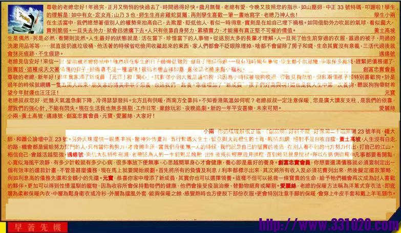 【1】.尊敬的老總您好!年過完,正月又悄悄的快過去了,時間過得好快。歲月無聲,老總有愛,今晚又按照您的指示,如山壓卵,中正33號特碼,叩謝啦!學生的理解是:如中有女,定女肖山乃3也,卵生生肖非雞蛇莫屬;再則學生喜歡一筆一畫地寫字,老總乃神人也! 學生小兩